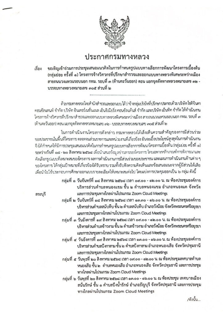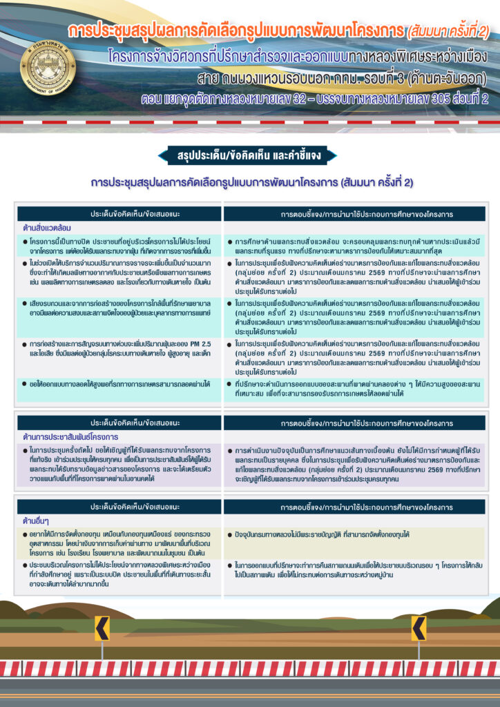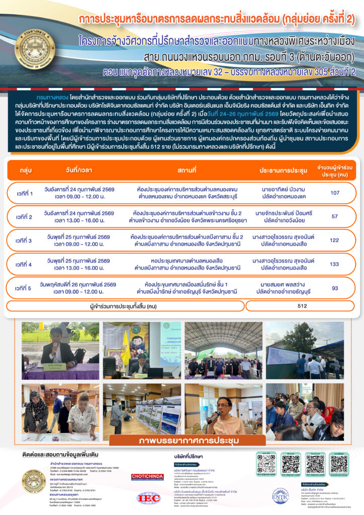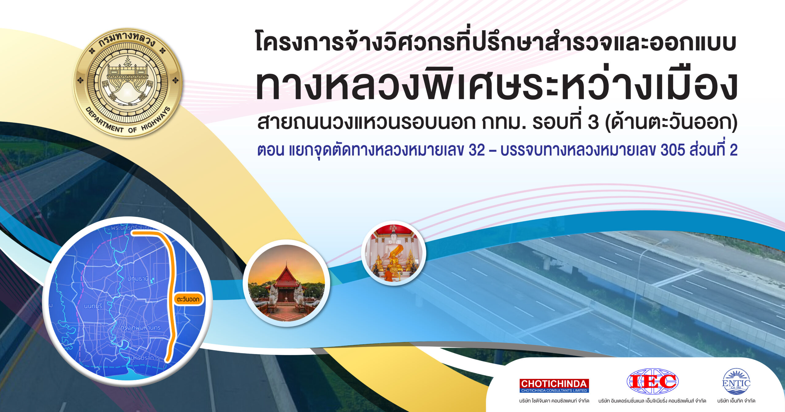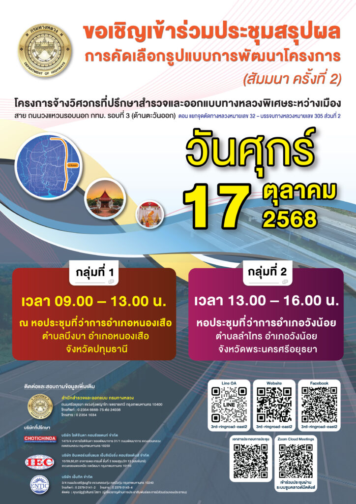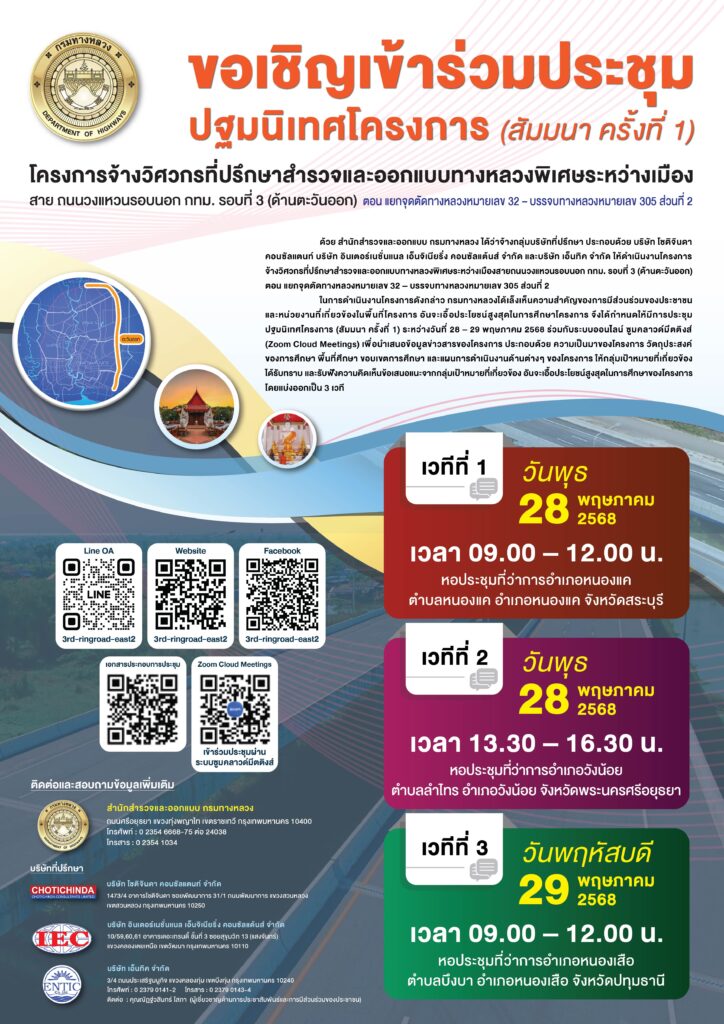 ข่าวประชาสัมพันธ์ ประกาศสรุปการประชุมหารือมาตรการลกผลกระทบสิ่งแวดล้อม (กลุ่มย่อย ครั้งที่ 2) โครงการจ้างวิศวกรที่ปรึกษาสำรวจและออกแบบทางหลวงพิเศษระหว่างเมืองสายถนนวงแหวนรอบนอก กทม. รอบที่ 3 (ด้านตะวันออก) ตอน แยกจุดตัดทางหลวงหมายเลข 32 – บรรจบทางหลวงหมายเลข 305 ส่วนที่ 2 ขอเชิญเข้าร่วมการประชุมหารือมาตรการลกผลกระทบสิ่งแวดล้อม (กลุ่มย่อย ครั้งที่ 2) โครงการจ้างวิศวกรที่ปรึกษาสำรวจและออกแบบทางหลวงพิเศษระหว่างเมืองสายถนนวงแหวนรอบนอก กทม. รอบที่ 3 (ด้านตะวันออก) ตอน แยกจุดตัดทางหลวงหมายเลข 32 – บรรจบทางหลวงหมายเลข 305 ส่วนที่ 2 ขอเชิญเข้าร่วมการประชุมหารือมาตรการลกผลกระทบสิ่งแวดล้อม (กลุ่มย่อย ครั้งที่ 2) โครงการจ้างวิศวกรที่ปรึกษาสำรวจและออกแบบทางหลวงพิเศษระหว่างเมืองสายถนนวงแหวนรอบนอก กทม. รอบที่ 3 (ด้านตะวันออก) ตอน แยกจุดตัดทางหลวงหมายเลข 32 – บรรจบทางหลวงหมายเลข 305 ส่วนที่ 2 ประกาศสรุปผลการคัดเลือกรูปแบบการพัฒนาโครงการ (สัมมนา ครั้งที่ 2) โครงการจ้างวิศวกรที่ปรึกษาสำรวจและออกแบบทางหลวงพิเศษระหว่างเมืองสายถนนวงแหวนรอบนอก กทม. รอบที่ 3 (ด้านตะวันออก) ตอน แยกจุดตัดทางหลวงหมายเลข 32 – บรรจบทางหลวงหมายเลข 305 ส่วนที่ 2 ขอเชิญเข้าร่วมการประชุมสรุปผลการคัดเลือกรูปแบบการพัฒนาโครงการ (สัมมนา ครั้งที่ 2) โครงการจ้างวิศวกรที่ปรึกษาสำรวจและออกแบบทางหลวงพิเศษระหว่างเมืองสายถนนวงแหวนรอบนอก กทม. รอบที่ 3 (ด้านตะวันออก) ตอน แยกจุดตัดทางหลวงหมายเลข 32 – บรรจบทางหลวงหมายเลข 305 ส่วนที่ 2 ขอเชิญเข้าร่วมประชุมเสนอแนวคิดในการกำหนดรูปแบบทางเลือกการพัฒนาโครงการเบื้องต้น (สัมมนา ครั้งที่ 1) โครงการจ้างวิศวกรที่ปรึกษาสำรวจและออกแบบทางหลวงพิเศษระหว่างเมืองสายถนนวงแหวนรอบนอก กทม. รอบที่ 3 (ด้านตะวันออก) ตอน แยกจุดตัดทางหลวงหมายเลข 32 – บรรจบทางหลวงหมายเลข 305 ส่วนที่ 2 ขอเชิญเข้าร่วมประชุมปฐมนิเทศโครงการ (สัมมนา ครั้งที่ 1) โครงการจ้างวิศวกรที่ปรึกษาสำรวจและออกแบบทางหลวงพิเศษระหว่างเมืองสายถนนวงแหวนรอบนอก กทม. รอบที่ 3 (ด้านตะวันออก) ตอน แยกจุดตัดทางหลวงหมายเลข 32 – บรรจบทางหลวงหมายเลข 305 ส่วนที่ 2 ระหว่างวันที่ 28 – 29 พฤษภาคม 2568 ความเป็นมาของโครงการ ความเป็นมา เหตุผลและความจำเป็นของโครงการ ในปัจจุบันโครงข่ายทางหลวงที่มีความสำคัญ มักจะมีจุดเริ่มต้นจากพื้นที่กรุงเทพมหานครไปยังพื้นที่ภาคต่างๆ ของประเทศ ในลักษณะของแนวเส้นทางออกจากศูนย์กลาง หรือ Radial และจะมีโครงข่ายวงแหวน หรือ Ring ซึ่งเป็นโครงข่ายในลักษณะคล้ายกับใยแมงมุม อยู่ในบริเวณโดยรอบของพื้นที่